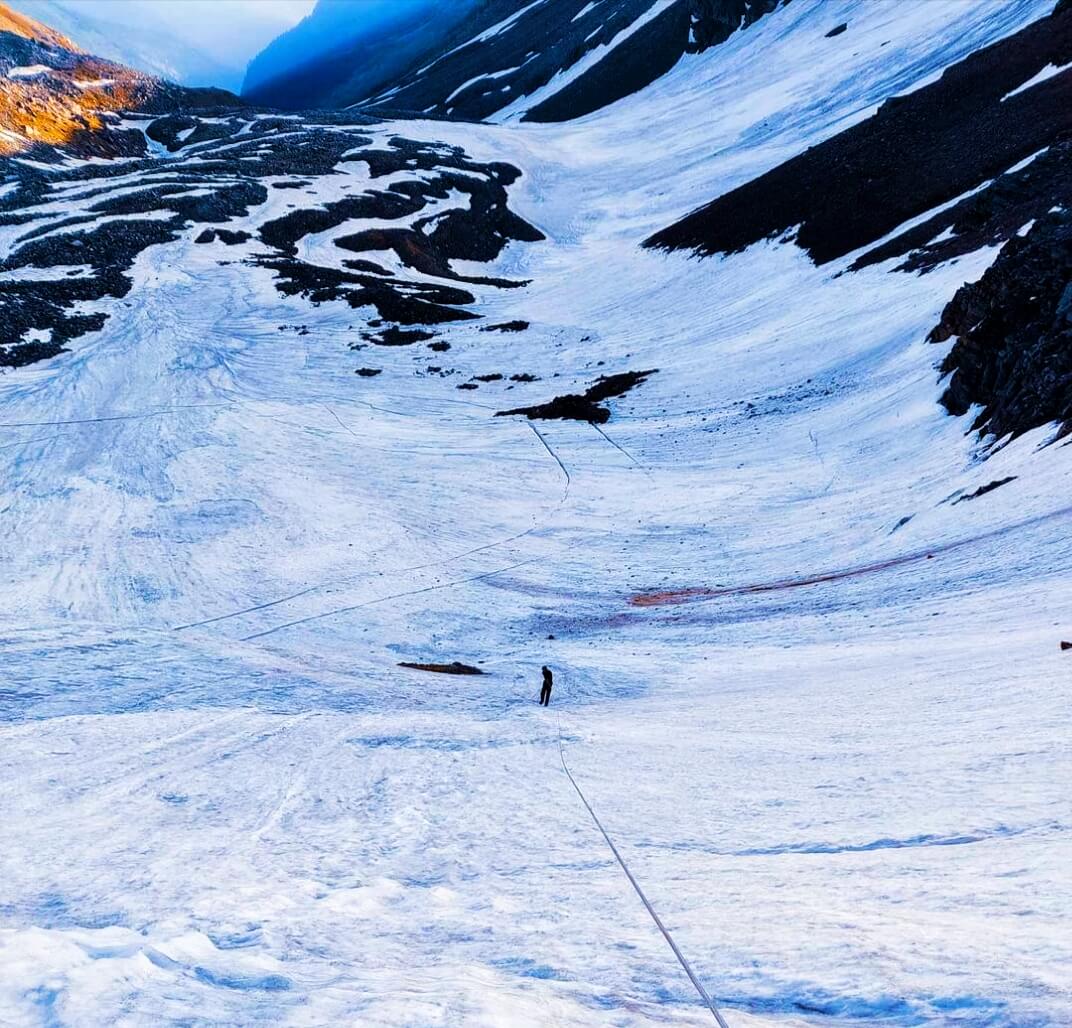 Litham is the trek's final meadow. You're now on your way to Dhunda, an alpine high-altitude camping. Grey boulders and ice spots will replace the green grass. The Dhauladhar range, as well as the Pabbar, continue to accompany you along a well-marked track. However, the river is now running considerably more quickly. You'll come to a U-shaped gorge-like valley if you stroll along the river's left side. Buran Ghati appears for the first time on your left at this point. Dhunda, at 13,300 feet, is situated against the Pass's foot. Unlike the earlier colourful campgrounds, this one is fully surrounded by snow in the summer. The height, as well as the prospect of traversing the Pass, will thrill you.