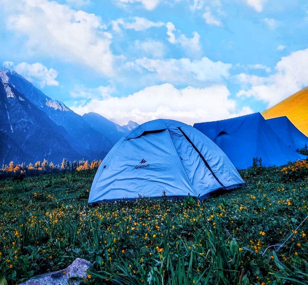 We also recommend getting up early to see the sunrise. You'll be intrigued by the interplay of golden rays and grey shadows across a wide carpet of grass. You are mistaken if you believe you have seen all there is to see of meadows. Today you will go across field after meadow, with woodlands strewn around. The first woodland you'll see is another pine forest, followed by silver birch, or bhoj. In ancient times, the bark of the bhoj tree was used to make paper. The path from Dayara to Litham is nearly all downhill, with many streams to cross. Guna Pass is visible among the now-snow-capped Dhauladhar range. The Litham campground is reached after crossing the Chandranahan creek. Litham, like Dayara, exudes a certain allure. The rocks that hide Buran Pass are just in front of you. The Chandranahan waterfall's mouth may be seen on your left. The Pabbar river is on your right, flowing sweetly before the mountain range that hides the Rupin valley. Because one day is spent on an excursion to Chandranahan Lake, you get to stay at this beautiful campground for two days.